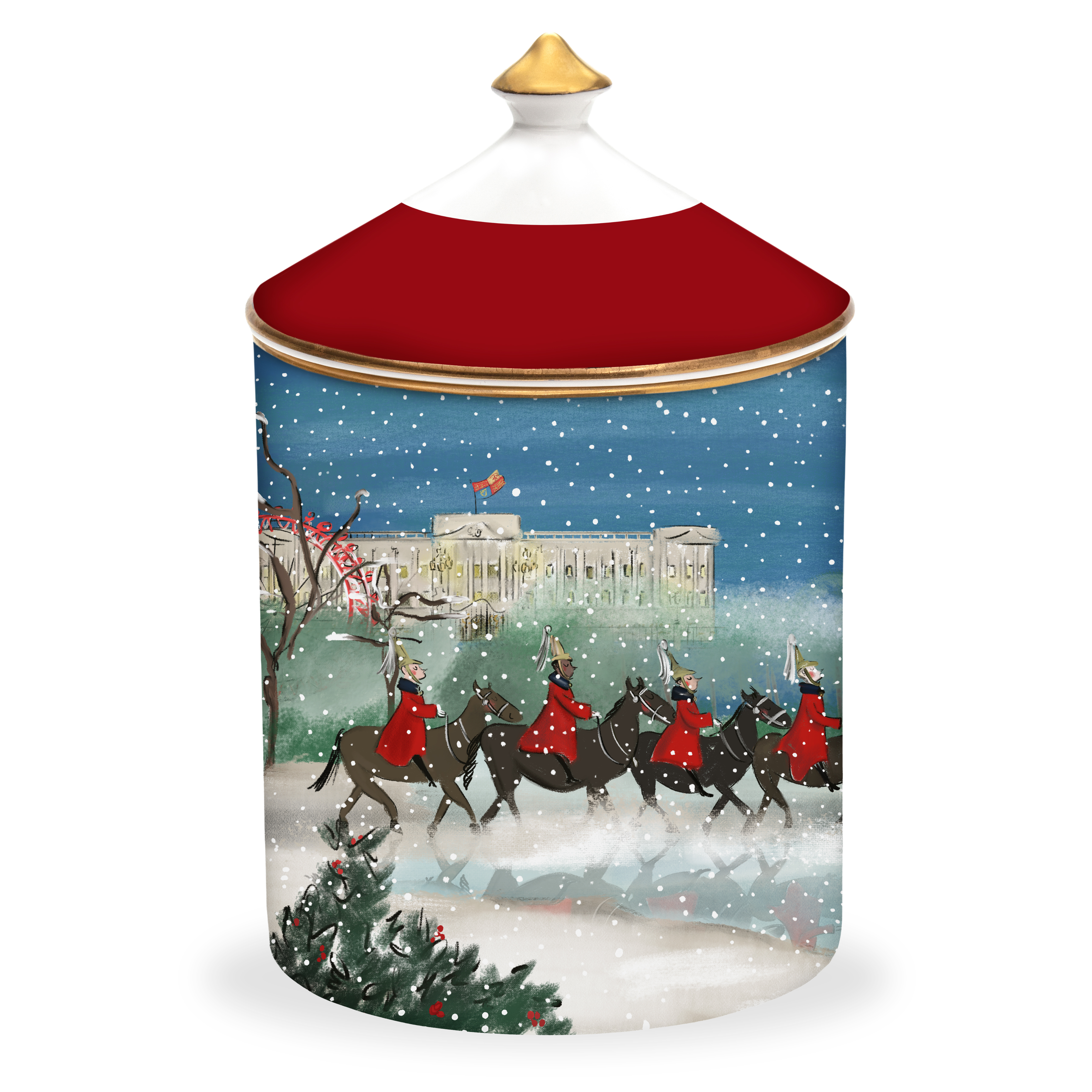 Bask in the enchanting moon-lit scene of the Life Guards on patrol in the snowy ground near Buckingham Palace in this whimsical illustration created by Tug Rice. Wearing bright red cloaks with pale plumed helmets and white gauntlets, the most senior regiment of the British Army is eminently recognisable as they play their part in the ceremonial life of London, even in the bleak mid-winter.